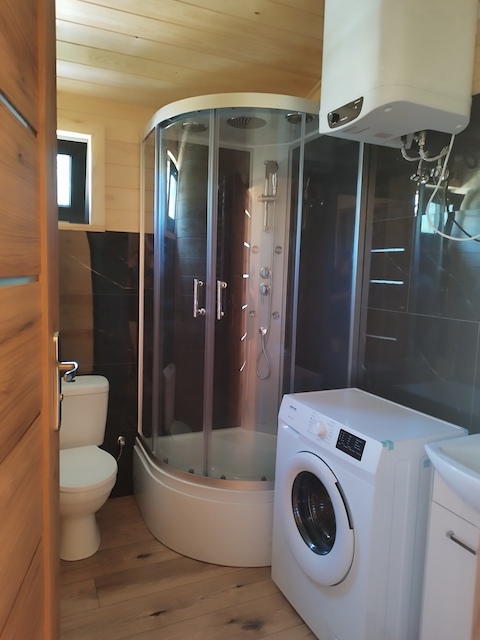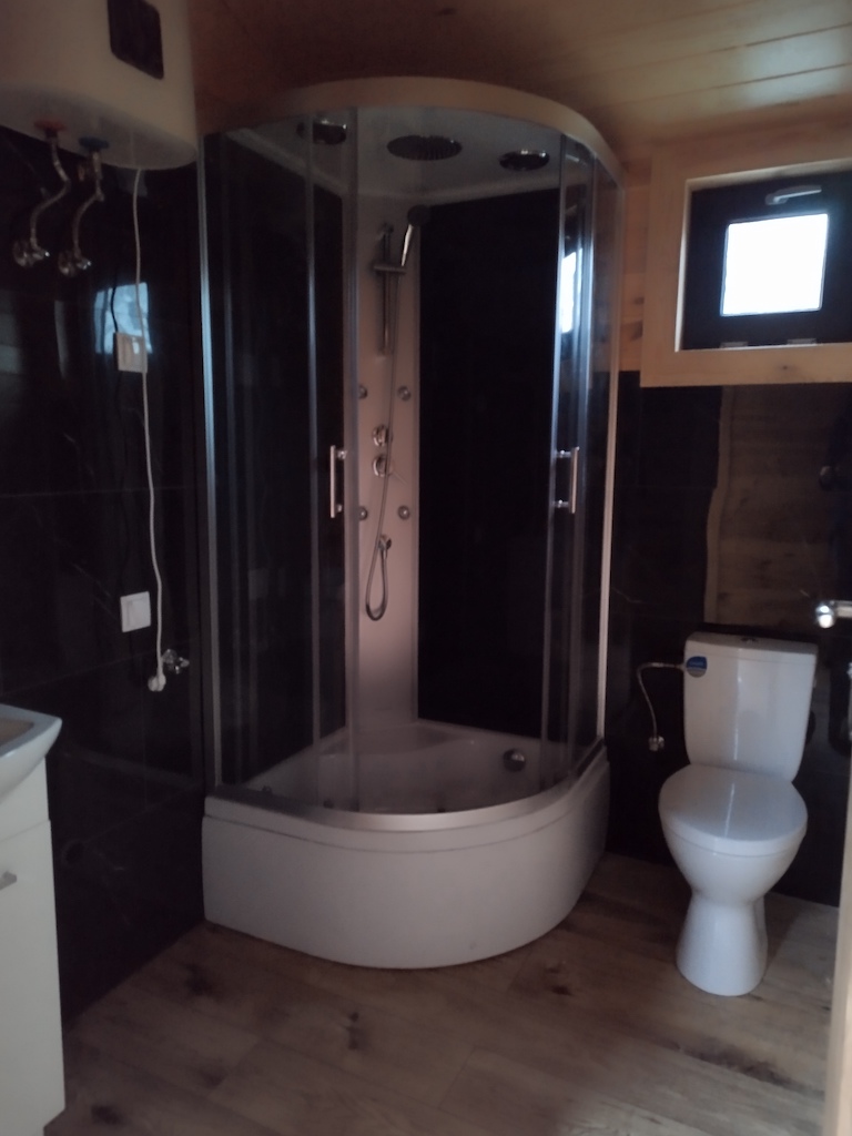 Kompletnie wyposażona łazienka (prysznic, umywalka, baterie, szafka umywalkowa, toaleta kompaktowa, terma, grzejnik)